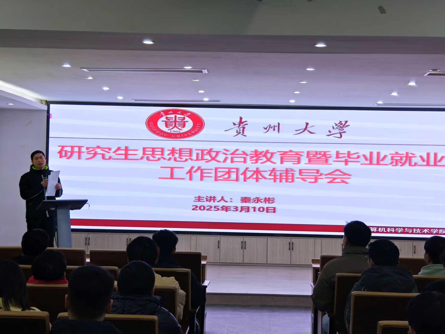 为全面贯彻党的教育方针,深化研究生教育改革,严格研究生日常管理,3月10日,计算机科学与技术学院(贵州保密学院)在博学楼13楼召开2025年研究生思想政治教育暨毕业就业工作团体辅导会。学院党委副书记、院长秦永彬出席会议,2022级、2023级全体研究生参加会议。会议由辅导员李忠强主持。